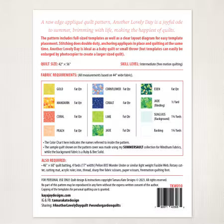 A raw edge appliqué quilt pattern, Another Lovely Day is a joyful ode to summer, brimming with life, making the happiest of quilts. The pattern includes full-sized templates as well as a clear layout diagram for easy template placement. Stitching does double duty, anchoring appliqués in place and quilting at the same time. Finished Quilt Size: 42" x 56". Skill Level: Intermediate (free motion quilting)
