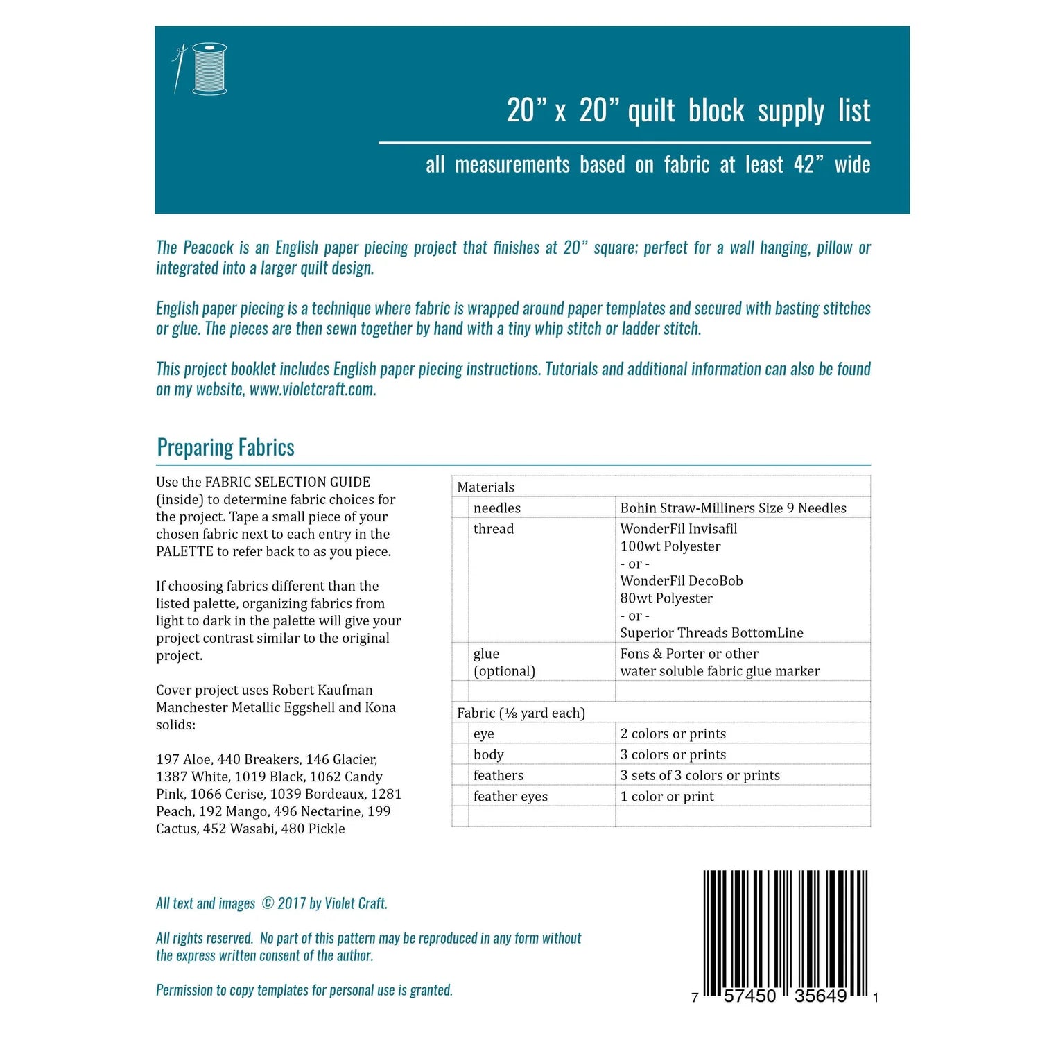 The Peacock is an English Paper Piecing (EPP) project that finishes at 20 inches square. The project booklet includes reusable templates, EPP instructions, coloring page and fabric selection guide.