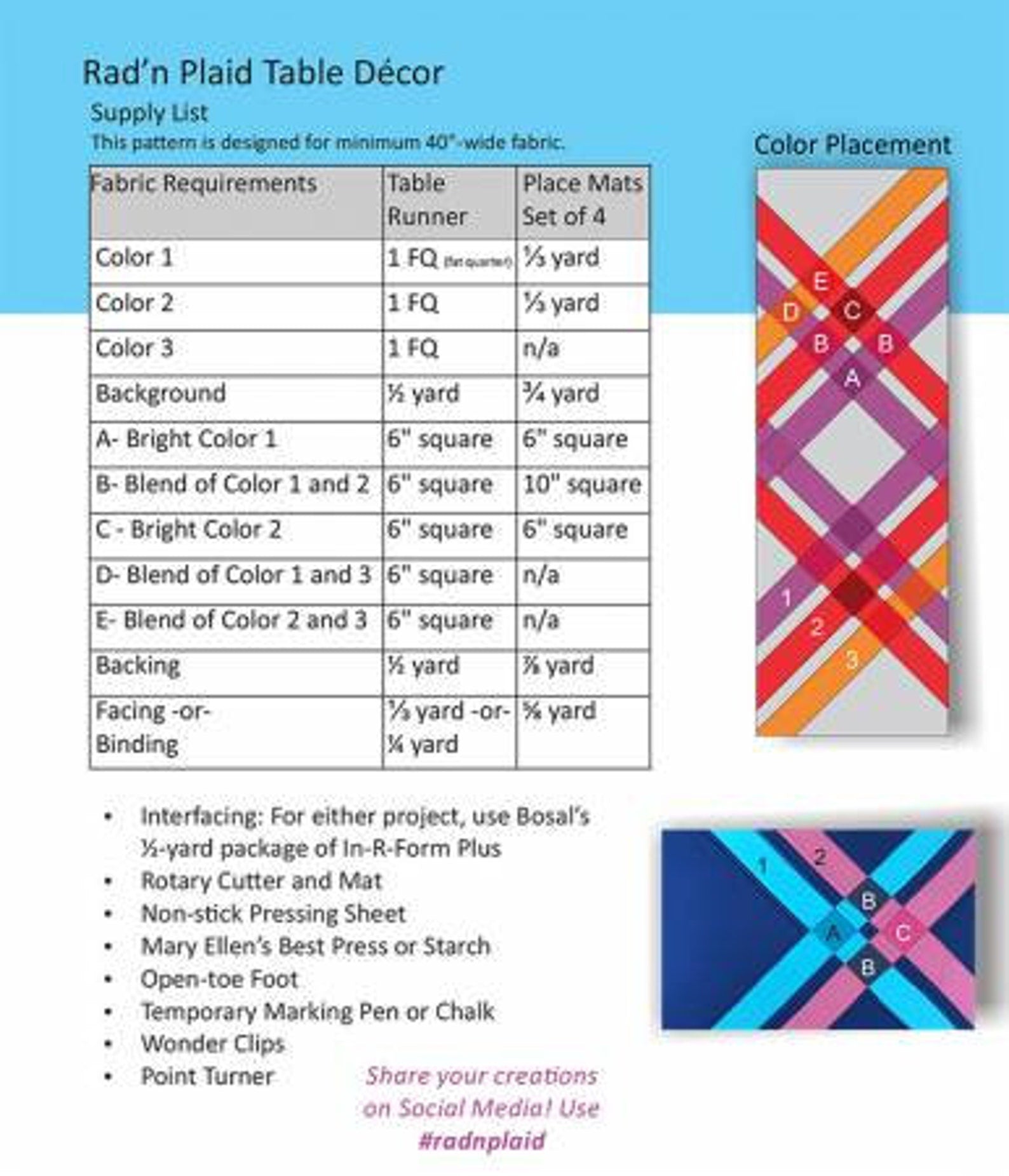 Rad'n Plaid - make your own plaid and level up your Table Décor! We have used In-R-Form for extra texture. This pattern features a facing technique in lieu of binding, Rad'n Plaid - make your own plaid and level up your Table Décor! We have used In-R-Form for extra texture. This pattern features a facing technique in lieu of binding, but traditional binding can be used. Table Runner 13" x 40", Place Mats 12" x 18"