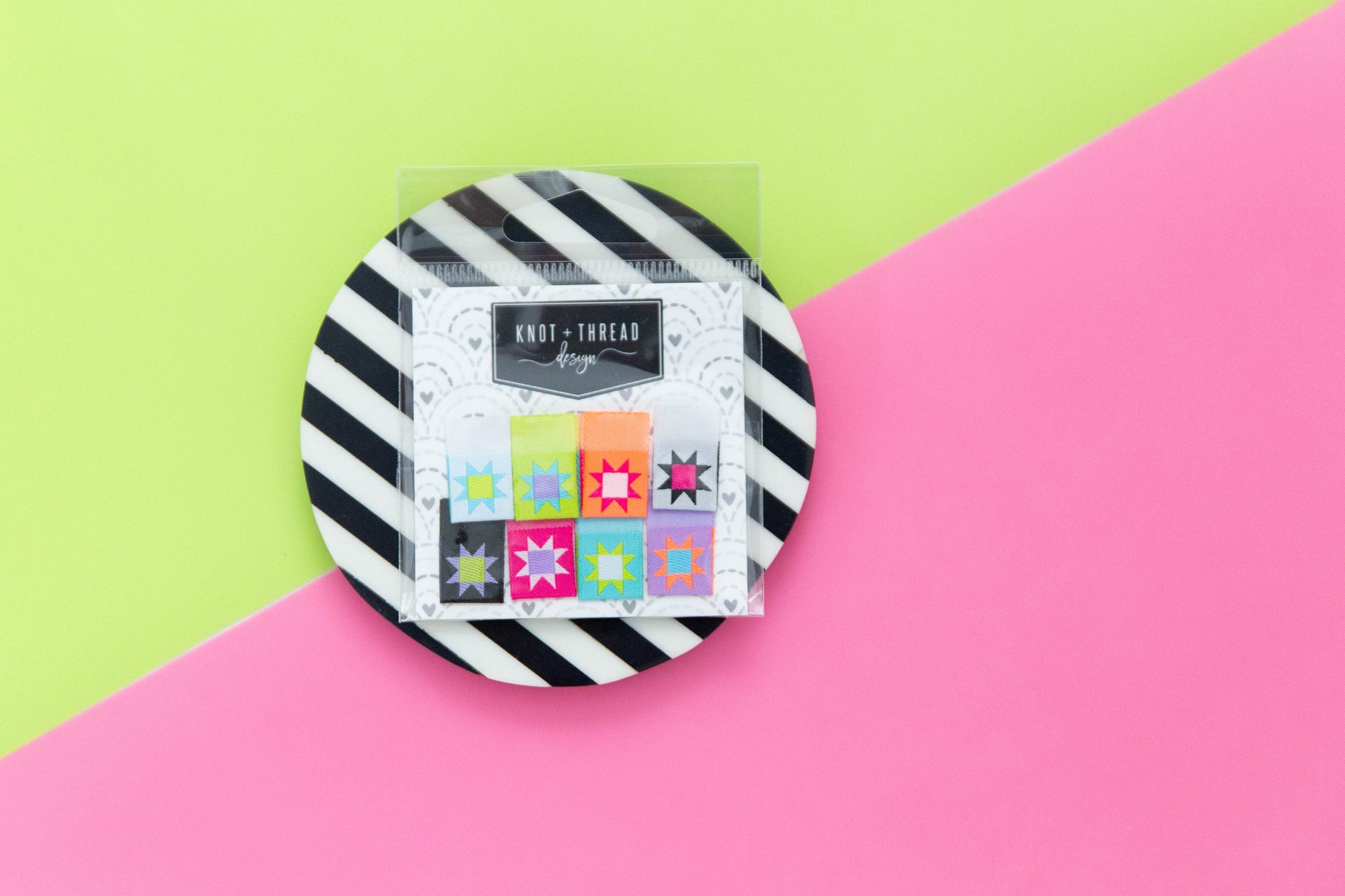 Add a pop of color and a touch of charm to your handmade projects with these Bright little Sawtooth Star sew-in labels! Featuring a bold, modern take on the classic sawtooth star quilt block, these labels come in a vibrant neon color palette that stands out beautifully against any fabric.