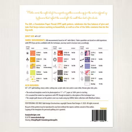 The Gift, #3 in the Wondergarden range. Foundation Paper Pieced Quilt Pattern (paper version). Finished Quilt Size: 40" x 55" Includes: Full size templates including 1/4" seam allowance (that need to be photocopied on 11" x 17" paper), instructions (including FPP guide), diagrams, overview assembly chart, fabric requirement list."